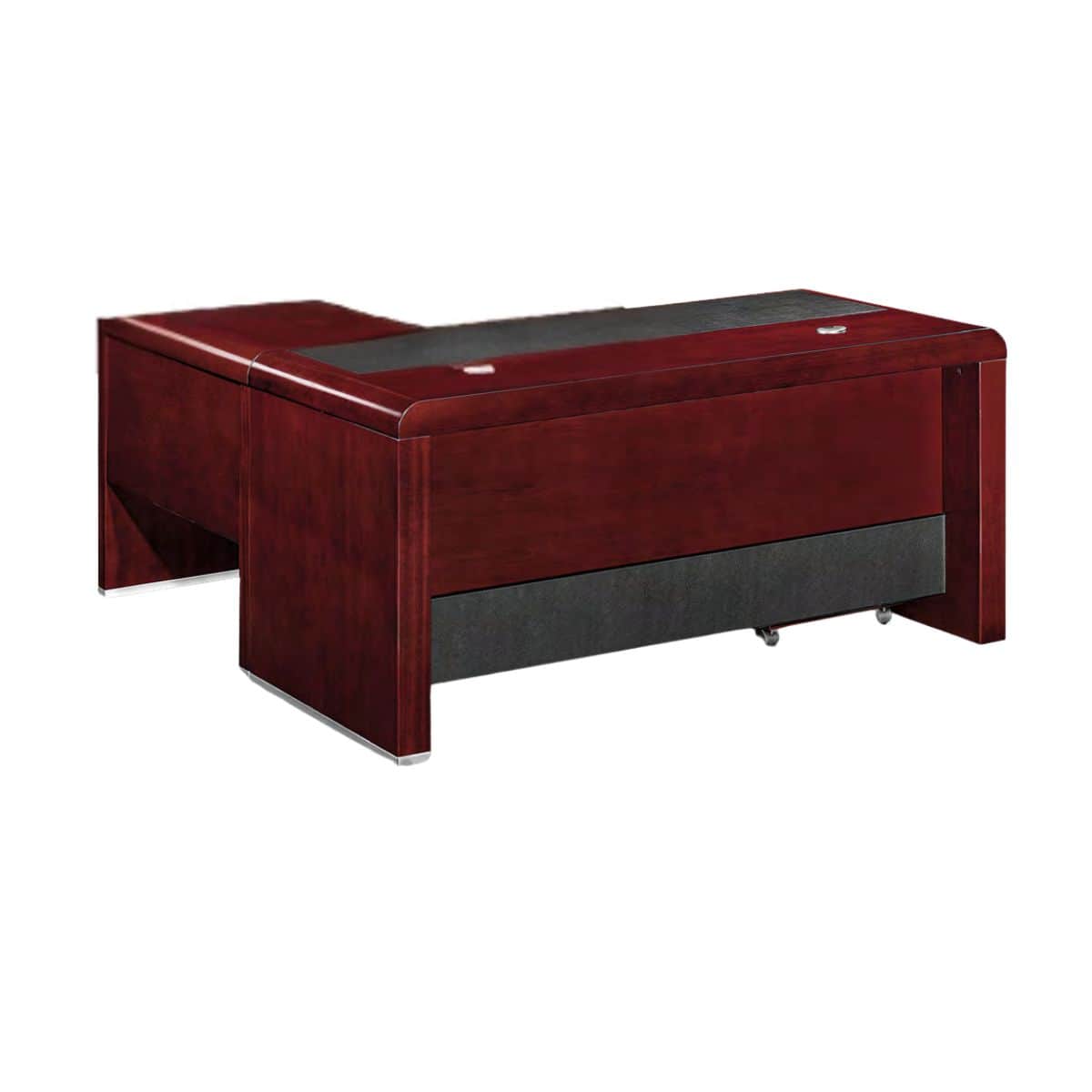 The desk features a rich mahogany veneer finish that enhances the professional appearance of any office. Its bold and refined design creates a strong executive presence while maintaining a modern aesthetic that complements contemporary office interiors.