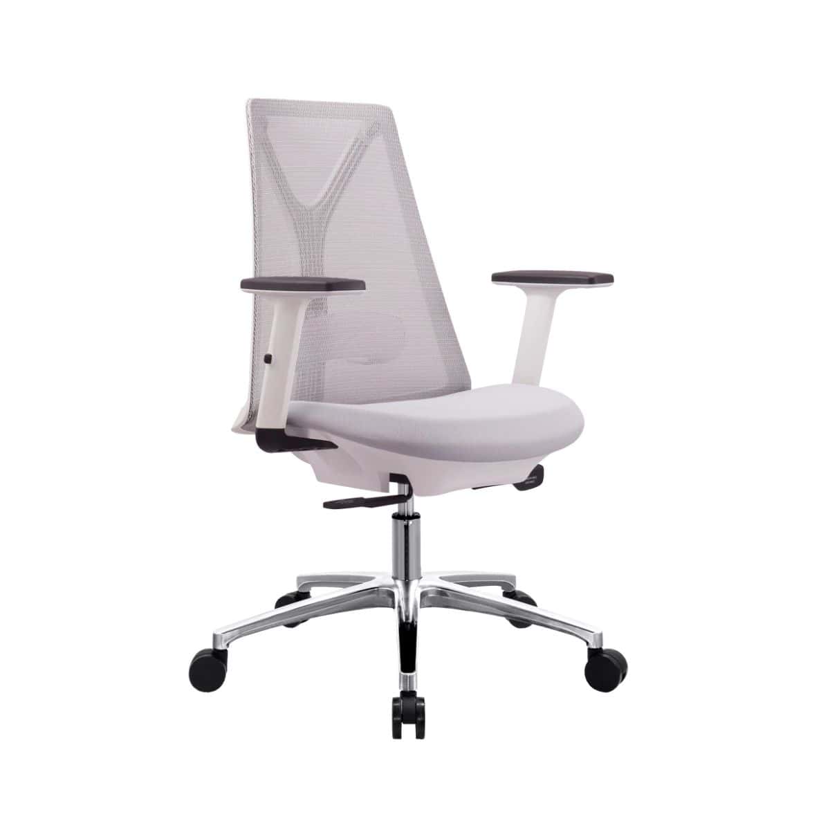 The breathable white mesh backrest encourages airflow and maintains comfort throughout the day. It helps reduce heat build-up and supports natural posture. The white fabric seat provides firm yet comfortable cushioning that holds its shape during regular use. Together, these materials create a balanced combination of comfort and durability.