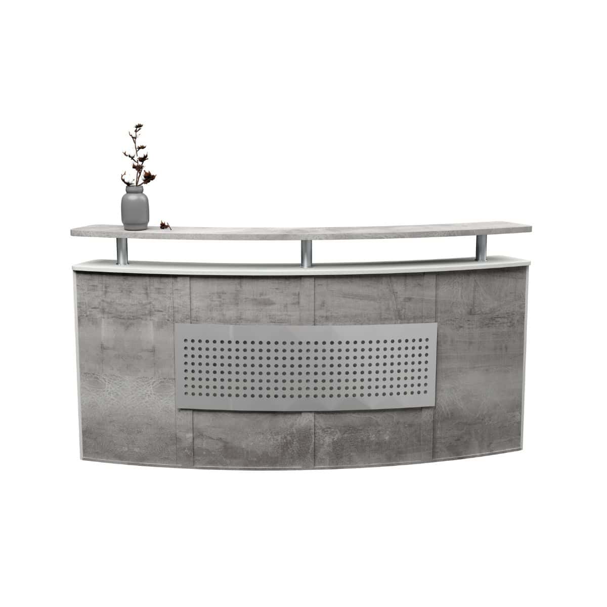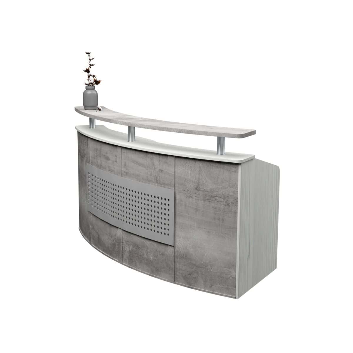 The unit incorporates a perforated metal feature panel that adds texture and contrast to the front design. Metal support pillars elevate the top counter, reinforcing the contemporary styling and adding structural stability. The combination of finishes delivers a balanced and refined look suitable for corporate offices, showrooms, consulting rooms and commercial reception areas.