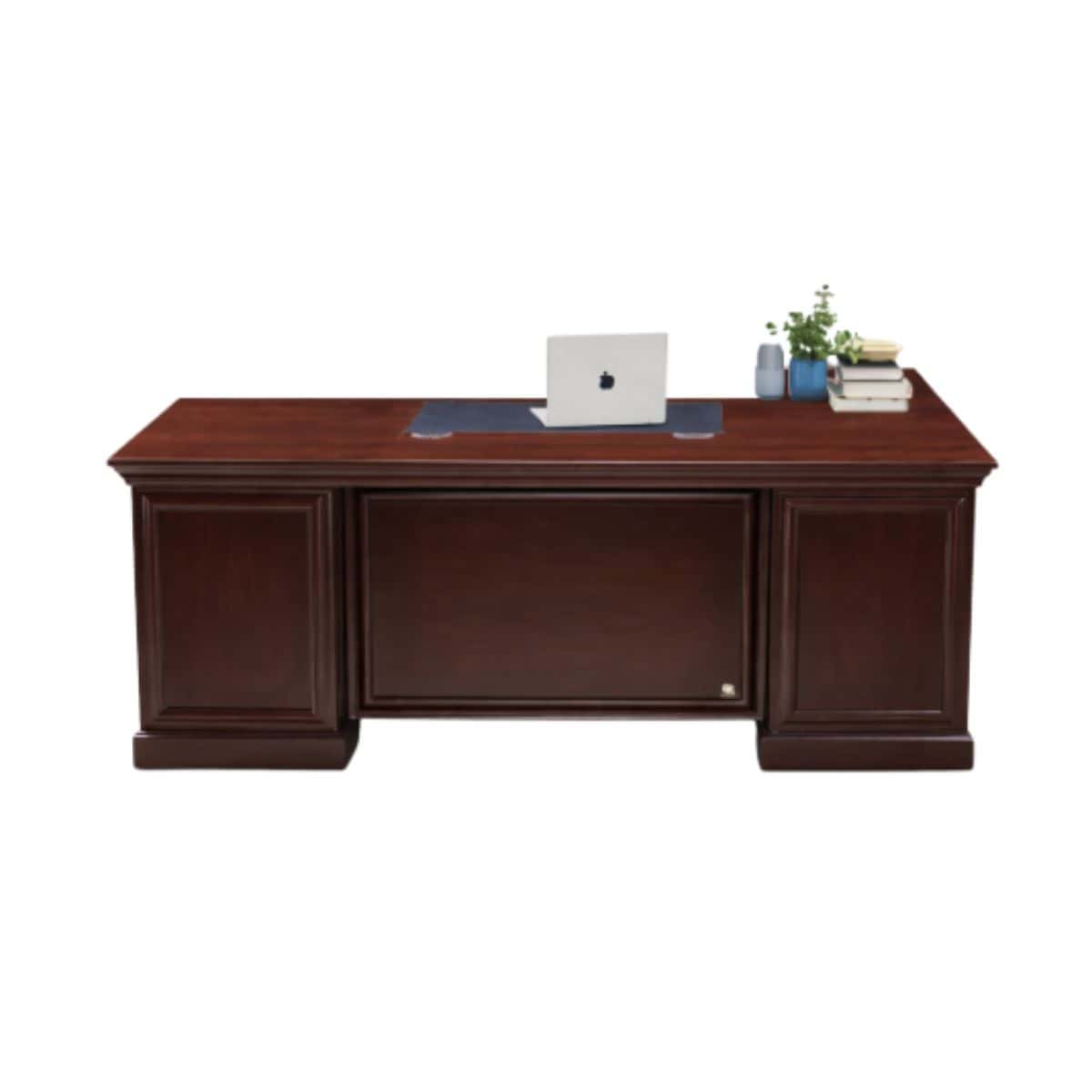 The desk features a large main work surface that comfortably supports laptops, monitors, documents, and office accessories. Furthermore, the refined panel design and rich wood finish give the desk a professional and elegant appearance. This makes it suitable for executive offices, management workspaces, and professional consulting rooms.