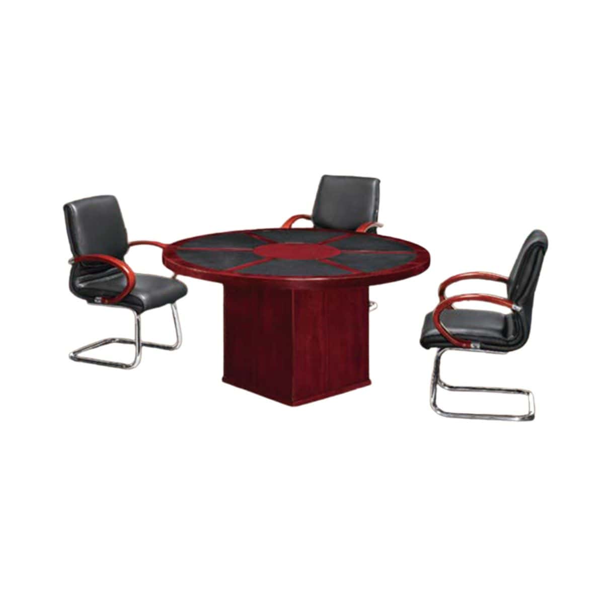 This round conference table features scratch resistant leather inlays on the tabletop. These inlays protect the surface from daily wear while also adding a refined and executive appearance. As a result, the table remains presentable even with frequent use in busy office environments.