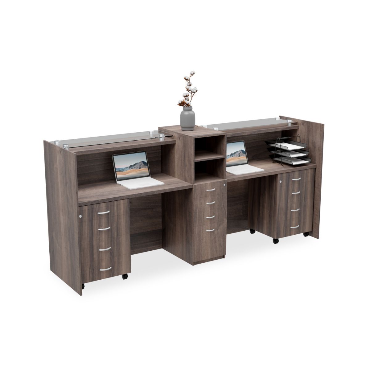 With generous dimensions of 3200mm x 800mm, the unit provides extensive workspace for computers, telephones, and reception tasks. Moreover, the wider layout allows multiple staff members to work comfortably without crowding the space.